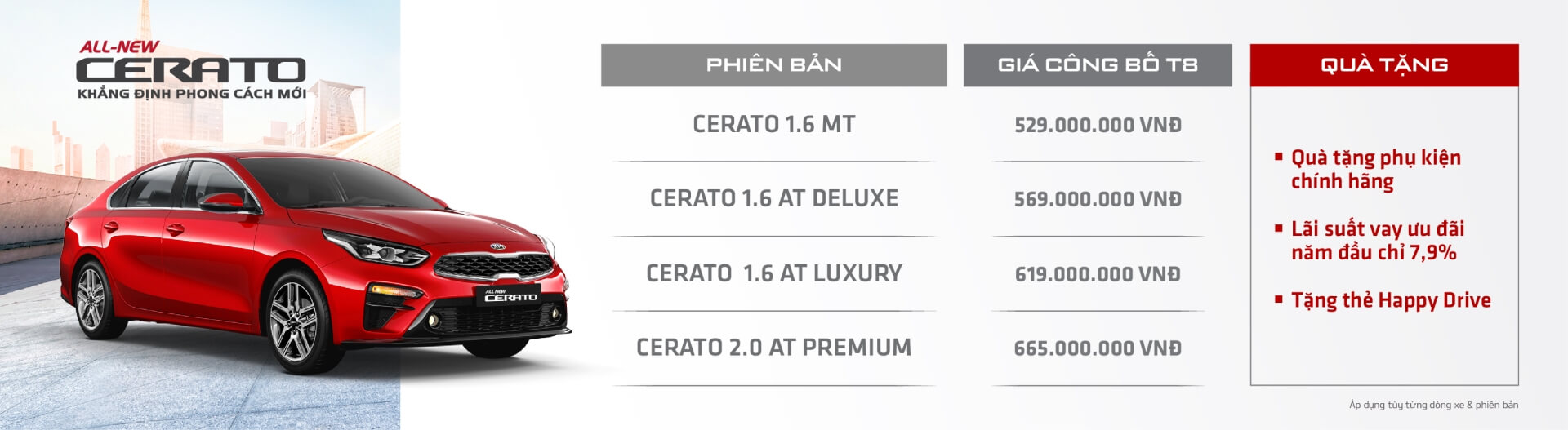 Với mức giá mới, C-sedan Kia Cerato có mức giá bán tốt nhất phân khúc C, thậm chí còn ngang bằng với một số mẫu xe trong phân khúc B. Đây là cơ hội hiếm có cho những khách hàng đang sử dụng xe phân khúc B muốn nâng cấp lên xe phân khúc C để sở hữu ngay một mẫu xe mới, sang trọng và tiện nghi hơn với mức giá tương đương. Các mẫu xe còn lại của Kia sẽ tiếp tục áp dụng mức giá mới tốt nhất theo từng phân khúc kèm theo quà tặng phụ kiện chính hãng.