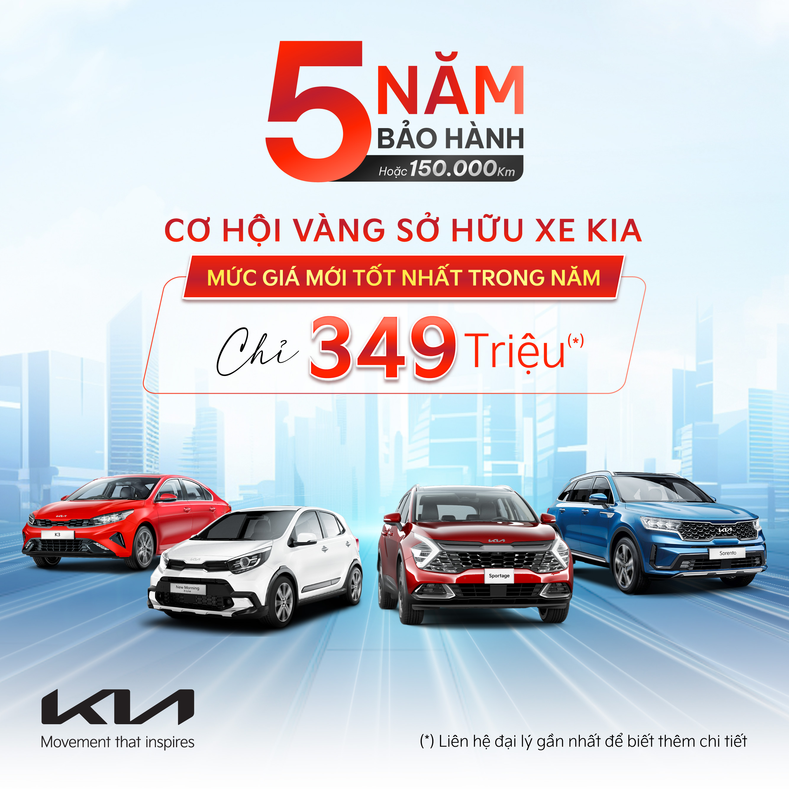 Từ 1/4/2023, Kia ưu đãi 100% phí trước bạ cho Kia K3, Kia Sportage cùng ưu đãi giá hấp dẫn lên đến 100 triệu đồng cho các mẫu xe khác, và thêm nhiều quà tặng tại Đại lý. Chương trình áp dụng tùy từng mẫu xe và phiên bản.