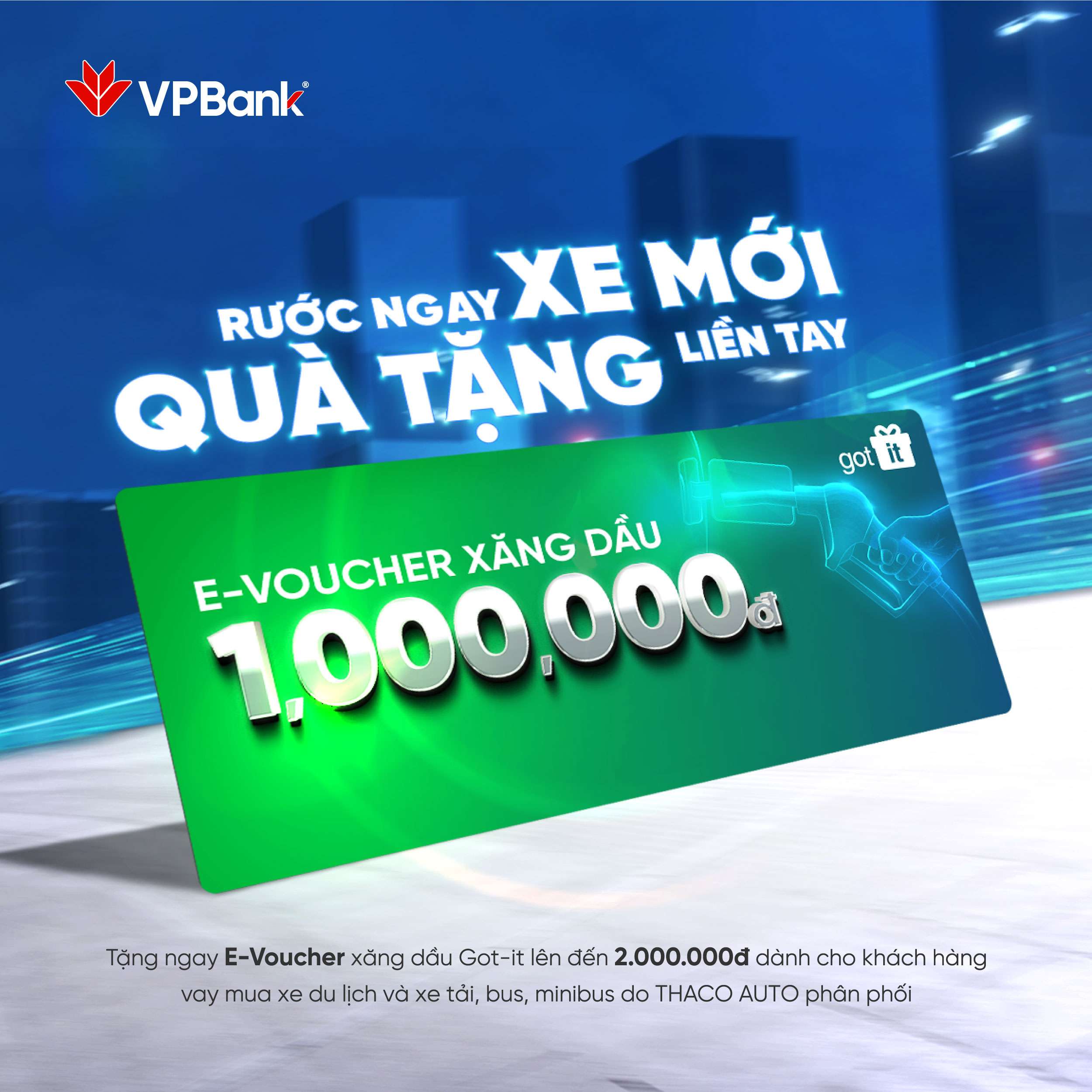 Tưng bừng chào đón lễ hội cuối năm, THACO AUTO và VPBank trân trọng gửi tới Quý Khách hàng chương trình ưu đãi độc quyền “Rước ngay xe mới, Quà tặng liền tay”, tặng ngay E-Voucher xăng dầu Got-it. Đừng bỏ lỡ, hãy tận hưởng ưu đãi hấp dẫn ngay hôm nay!